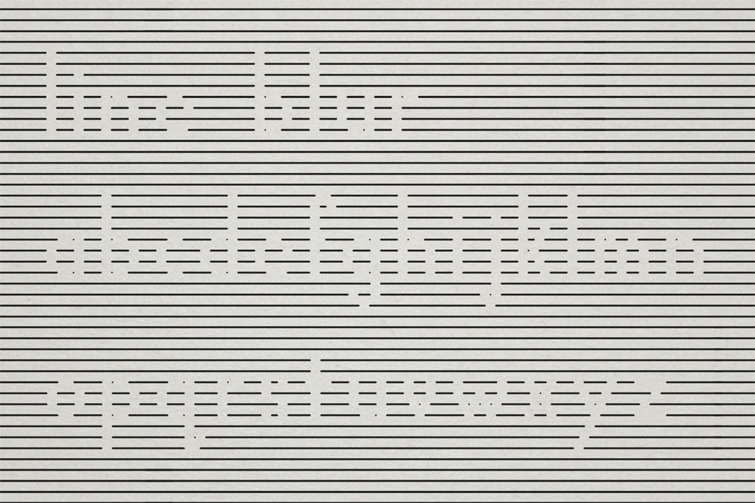 This display font was inspired by the visual effect of observing people's shadows through window blinds. I was intrigued by the interplay of light and shadow and translated that into a typeface that emphasizes negative space and optical illusion. Each character is composed of evenly spaced strait horizontal lines, with characters being formed through breaks in the line.